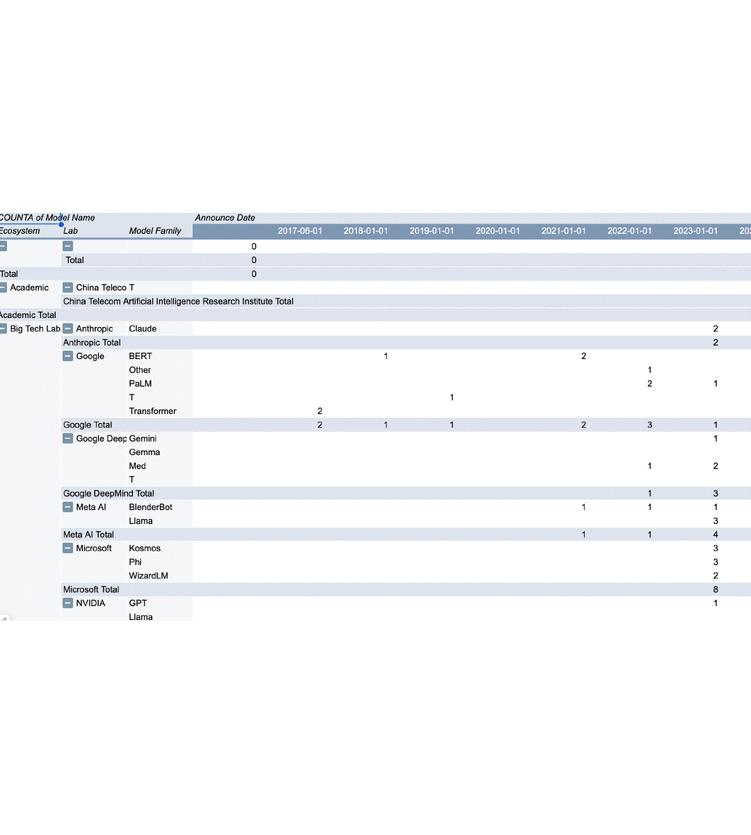 The challenge was in the filtering. I wanted to avoid a cluttered mess of one-off experiments, so I narrowed the dataset to model families that had more than one release. In other words, if a lab built a single model and never followed up, I removed it. This left me with the “serious players,” and suddenly the dataset felt sharper, more meaningful.