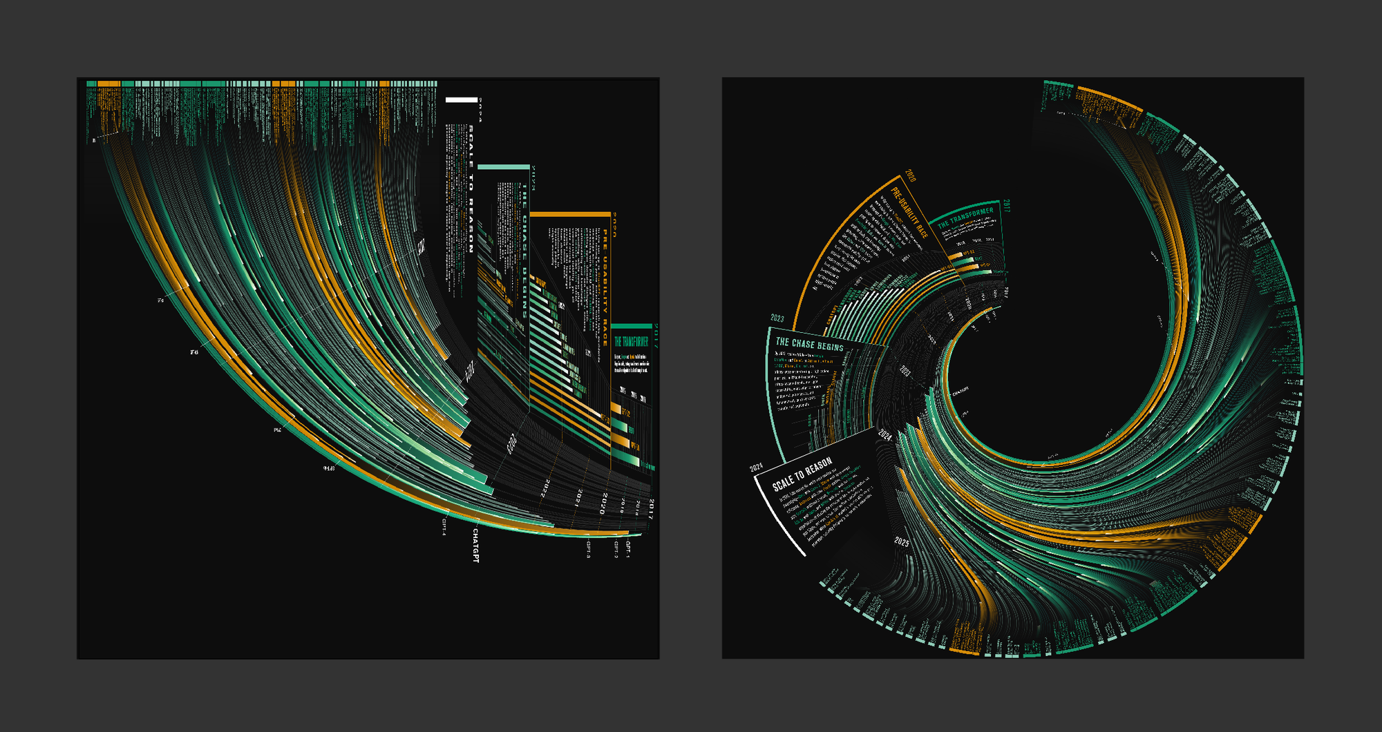 Does it succeed in being universally approachable? Probably not. If you don’t already know what an LLM is, or the names of the main labs, you won’t immediately decode the signifiers. But that wasn’t the only goal. I wanted the piece to feel like the phenomenon itself: overwhelming, futuristic, brain-bending. The final graphic sits somewhere between data visualization and art—it’s less about quick consumption and more about evoking the spectacle of this moment in AI history.