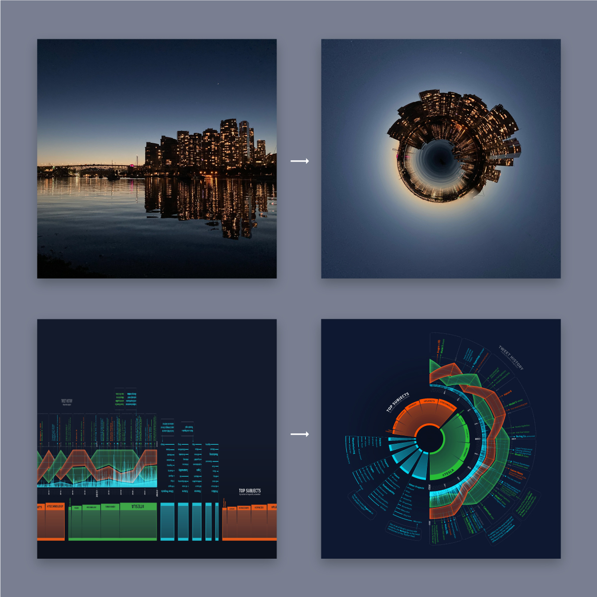 From there came the design problem: how to show both the grouping (models belonging to a lab) and the sequence (order of release). I leaned on a branching evolutionary tree diagram generated with Python, which gave me a raw vector structure. That became the backbone. But the form you see today—the flowing, wave-like geometry—came from layering on a warping technique I had previously developed. It’s based on the “tiny world” Photoshop effect, but applied in a radial warp before the final circular distortion. It’s finicky to work with, but the control it gives me is precise and allows me to place labels with intention.